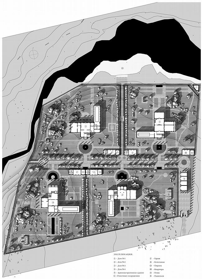Это проект поселения, состоящего из четырех частных домов по 2000 квадратных метров каждый. Масштаб одного такого здания совместим с барским домом дворянской усадьбы периода между «указом о вольности дворянской» и началом русского капитализма, уничтожившего этот образ жизни. Однако усадебный дом классицизма был безусловным центром ансамбля, иными словами, он был один. Современная практика требует, чтобы домов, даже больших, было несколько – они получают общий забор, охрану, коммуникации, и строительство становится окупаемым. При этом возникает специфическая архитектурная задача объединить четыре здания, смысл каждого из которых по определению – быть абсолютным лидером ансамбля. Она сродни известному анекдоту про то, что если художникам приказать: «по порядку рассчитайсь», то получится так – «первый, первый, первый…».