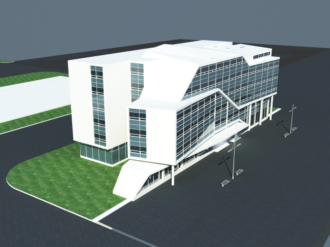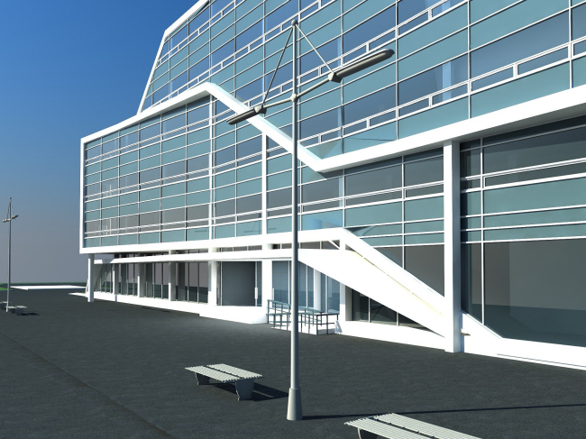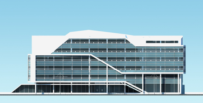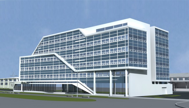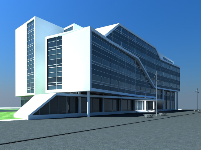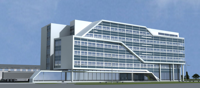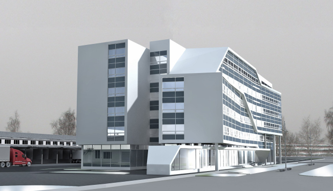 Этим, наверно, в первую очередь и объясняется функциональная программа комплекса, который спроектировала ПТАМ Виссарионова. Будущее здание, хоть и называется гостиницей, состоит в основном из офисов (из 8,5 тысяч квадратных метров на гостиницу приходится всего 811, тогда как на рабочие помещения больше 5 тысяч). По сути, небольшой блок с уютными номерами впаян в тело конторского помещения, а входы в офисы и гостиницу разведены по разные стороны здания для того, чтобы ночующие дальнобойщики и руководящие ими менеджеры не пересекались без необходимости. Архитектура комплекса, с одной стороны, тоже сугубо деловая: прямоугольные объемы и широкие полосы окон напоминают классический модернизм 1970-х годов, все заводские и институтские здания, которые были в изобилии построены в то время. С авторами проекта трудно не согласиться: подобное решение как нельзя более уместно в промышленных условиях, – однако при более внимательном знакомстве с проектом оказывается, что брутальность и лаконизм модернизма архитекторы органично дополнили элементами хай-тека.