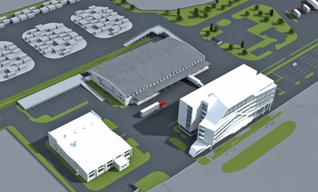 Рядом с плоским прямоугольным ангаром Мультимодального центра и предсказуемой «коробкой» ремонтной мастерской здание гостиницы-офисов выглядит представительным и современным. Стеклянные стены, яркая белая оболочка и скульптурная пластика главного объема превращают его в парадный фасад всего логистического комплекса.