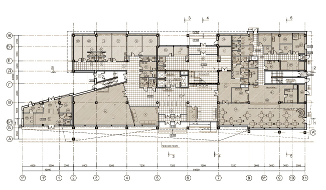 Объем, сплетенный из трех изогнутых «полос» – это парадная, фасадная половина здания. Дворовый блок представляет собой прямоугольный параллелепипед, также расчерченный горизонтальными лентами окон. На втором этаже этой части здания как раз и расположена гостиница, а в торцах между двумя объемами спроектированы лестницы – они утоплены глубоко в боковые фасады, поэтому в плане (особенно на втором этаже) комплекс напоминает нечто среднее между буквами «Н» и «К».