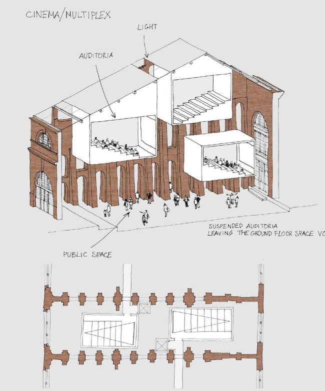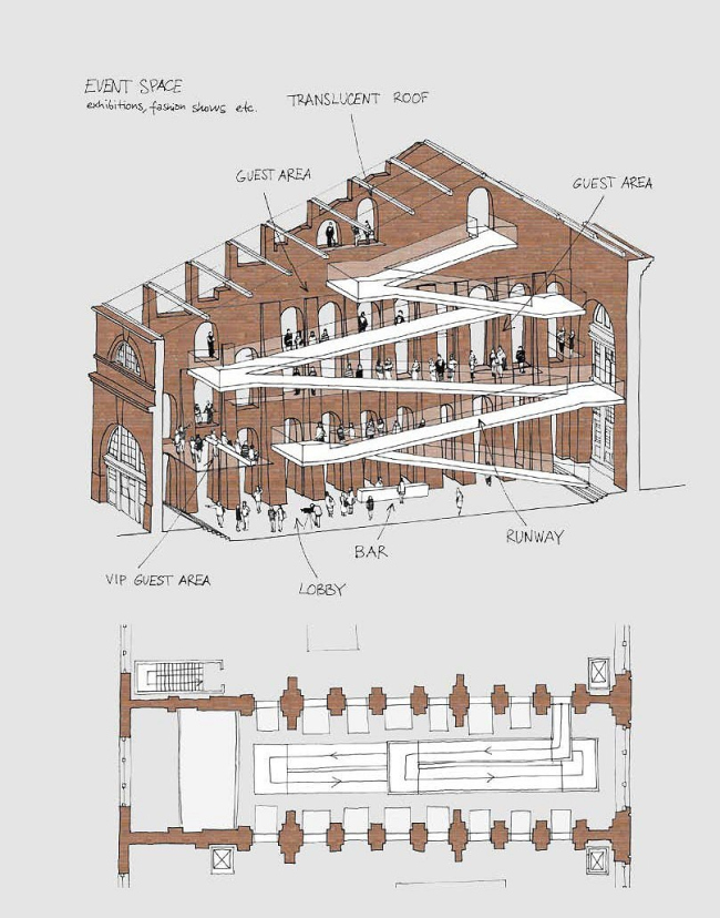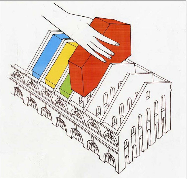 Многочисленные культурные функции – театры, художественные салоны и мастерские, творческие студии и лаборатории, а также магазины и кафе – «Студия 44» предлагает разместить в бывших складах корабельного леса, которые составляют основную часть застройки Новой Голландии. Эти здания, прежде служившие для сушки корабельного леса (бревна ставились вертикально), имеют уникальную структуру: они состоят из пятидесяти отсеков габаритами 33х9х20 м. По мысли архитекторов, эти «боксы» способны вместить самые разные функции – от аудитории и арт-галереи до небольшого зрительного зала и лофта. Комбинируя эти виды приспособления в разных сочетаниях, можно чрезвычайно гибко и быстро варьировать схему функционального наполнения комплекса: на эскизах «Студии 44» хорошо видно, насколько разной может быть «начинка» исторических корпусов, сложенных из красного кирпича.