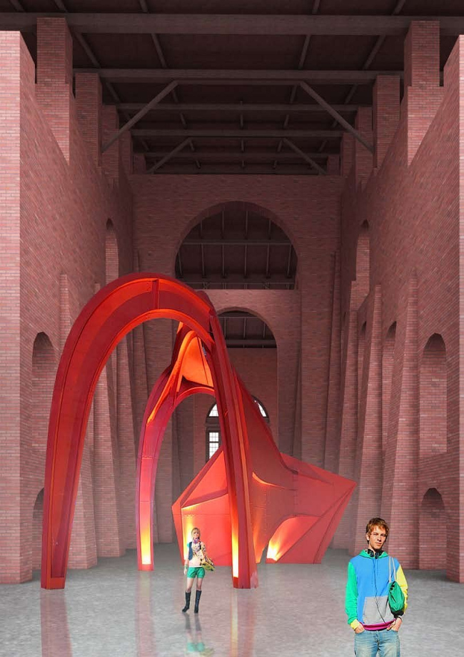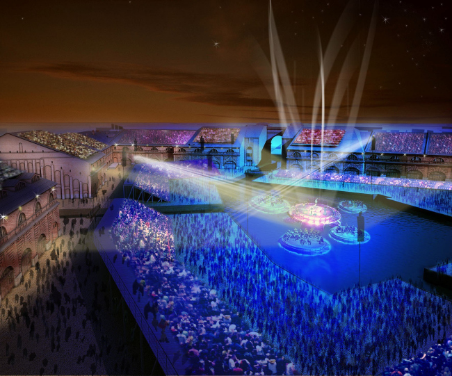 Антиподом Дворцовой в проекте реконструкции Новой Голландии становится внутренняя треугольная площадь острова, в центре которой расположен пруд. Сейчас этот водоем, честно, скорее отпугивает своим внешним видом, но архитекторы придумали, как максимально использовать его потенциал: система шлюзов даст, с одной стороны, сохранить навигацию малых судов (с этой целью «Студия 44» даже пробивает новый канал, соединяющий пруд с Адмиралтейским каналом), а с другой позволит очищать, подогревать и замораживать воду в пруду. Летом, таким образом, в нем можно будет даже купаться, зимой превращать в каток, а при необходимости водоем можно осушить и трансформировать в сценическую площадку. В последнем случае вся площадь превращается в большой фестивальный центр под открытым небом, а его «вестибюлем» служит лоджия – гигантская арка, светопрозрачным кожухом накрывающая малоэтажное здание кузницы, построенное в середине XIX века по проекту военного инженера Пасыпкина рядом со знаменитой круглой тюрьмой.