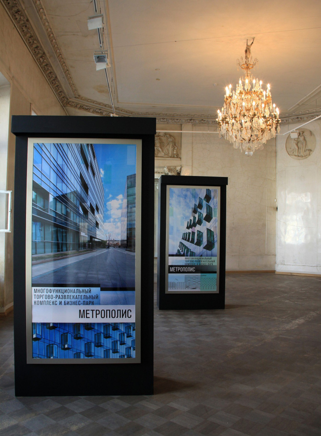 Самый первый зал анфилады посвящен бюро и спонсорам выставочного проекта: компании Asteros, Aluterra, Bene, Stroymoda, Mercury, HunterDouglas, Zumtobel, Guardian. Здесь же размещен фотоколлаж, на котором собраны портреты всех сотрудников ABD Architects, как нынешних, так и тех, кто когда-то начинал свою работу в этом бюро (например, Алексей Бавыкин, Антон Надточий и Вера Бутко, Наталья Сидорова и Данила Лоренц, давно ушедшие в свободное плавание). Прочие комнаты знаменитой анфилады полностью отведены под работы мастерской. Интересно, что организаторы сделали основной упор на визуальную информацию: проекты не сопровождены ни текстовыми пояснениями, ни даже указанием площади и точного адреса. И, в общем, этот расчет не только понятен, но и оправдан: архитектура говорит сама за себя – масштабные выразительные фотографии лишь кое-где дополнены разрезами, генпланом и конструктивными схемами. Те же, кому интересно получить полное досье на каждый объект, могут взять с собой на память о выставке буклеты «Архитектура» и «Интерьеры», вложенные в одну узкую и длинную папку из черного картона с прорезанными прямоугольными окошками, отсылающими к фасадам «Метрополиса».