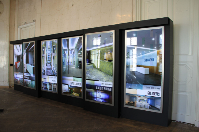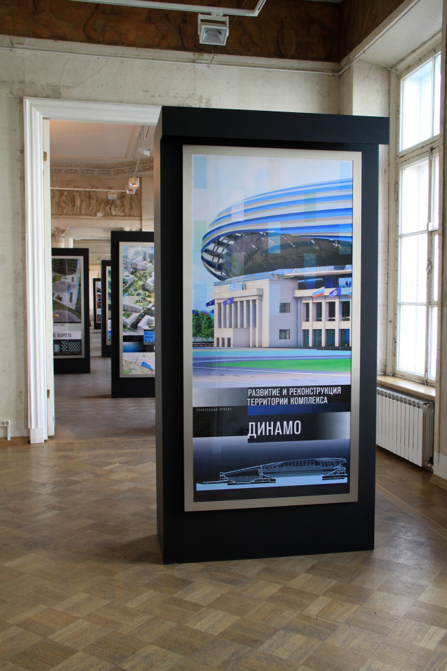 Для юбилейной презентации своих работ бюро спроектировало специальные стенды черного цвета, которые могут быть размещены как вдоль стен, так и в центре музейных залов. В последнем случае они объединяются попарно и превращаются в основательные конструкции, своей массивностью как нельзя лучше соответствующие просторам и ритму анфилады Музея архитектуры. А представить постройки и проекты ABD Architects в самом выгодном свете помогает специальная подсветка, предусмотренная внутри каждого стенда и позволяющая не использовать точечные светильники, нередко награждающие музейные экспонаты досадными бликами.
