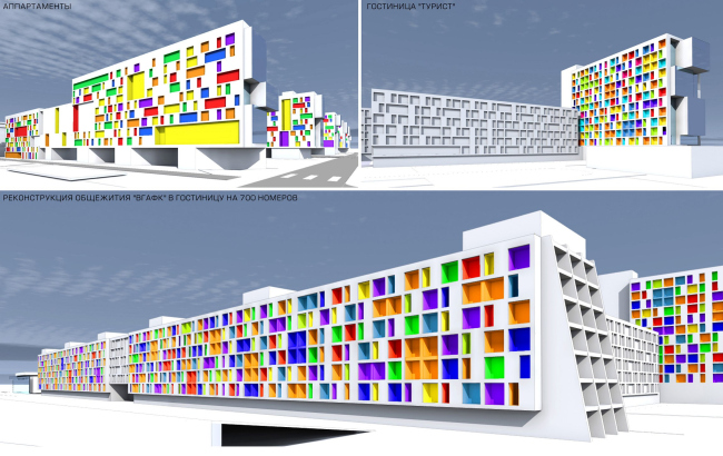 К решению проблемы нехватки гостиниц архитекторы подошли комплексно. С одной стороны, они проектируют целый квартал апартаментов, который примкнет к северо-западной границе территории стадиона, с другой – реконструируют уже имеющиеся неподалеку от Центрального парка студенческие общежития и гостиницу «Турист», с третьей – предлагают задействовать водную акваторию реки и разместить на Волге плавучий отель. И если последний объект имеет подчеркнуто «судоходные» обтекаемые формы, то наземные гостиницы решены в единой со стадионом цветовой гамме – протяженные плоскости фасадов украшены яркими плашками, придающими сооружениям яркий и праздничный облик. Понятно, что после ЧМ-2018 эти объекты ждет разная судьба: апартаменты, используемые для временного размещения болельщиков, будут выставлены на продажу и пополнят, таким образом, жилой фонд города, реконструированные общежития будут возвращены студентам волгоградских вузов, а плавучий отель может быть просто демонтирован и отправится по воде туда, где в нем будут нуждаться.