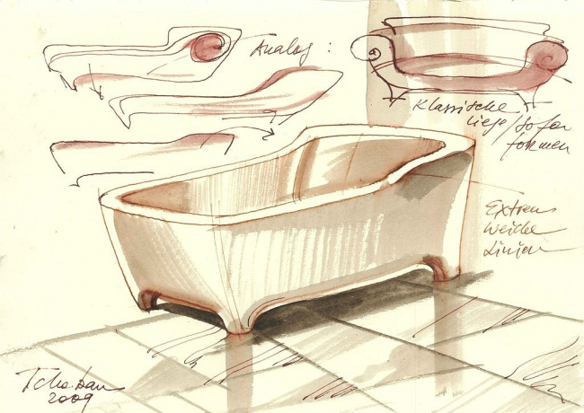 Как рассказал собравшимся сам Сергей Чобан, в качестве источника вдохновения в работе над серией Esplanade он выбрал спокойные классические формы, характерные для предметного и архитектурного дизайна XVIII и XIX веков. Мягкие, плавные линии и крупные обтекаемые формы, напоминающие старинную мебель, рассчитаны на размещение в просторных ванных комнатах, которые, по словам архитектора, сегодня все чаще становятся неотъемлемой частью жилого пространства, продолжением анфилады комнат.