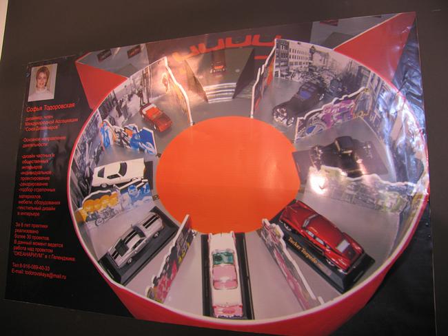 По стенам развешены планшеты с изображением квартир, офисов, магазинов и тематических ресторанов. Проект ресторана «Припаркуйся на время» Софьи Тодоровской предлагает микст экстерьеров разных эпох: круглый танцпол окружен небольшими залами, каждый из которых создает атмосферу какой-то части XX века, главным образом силами помещенного в центр ретро-автомобиля от бьюика до кадиллака. Пространство офиса коммуникационной компании Zero Алексея Левчука сконструировано мощными прямыми плоскостями и длинными коридорами. Видимо, лаконизм помогает выстраивать эффективную коммуникацию.