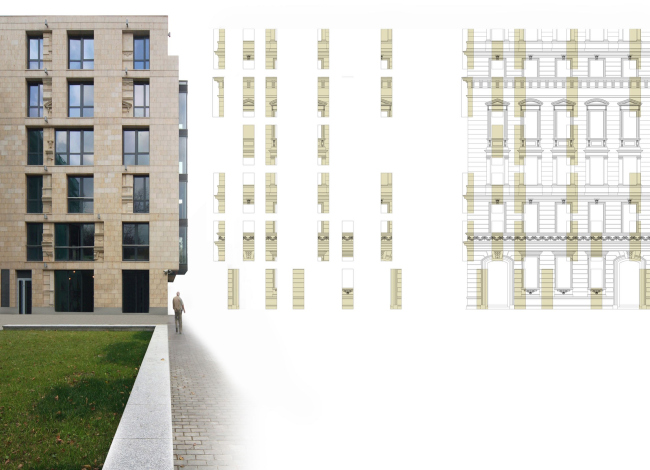 Однако архитекторам «Группы АБВ» очень хотелось каким-то намеком сберечь хотя бы визуальную память об утраченном наследии. Это желание, а также изучение европейского опыта натолкнуло их на идею создания сложного скульптурного фасада. «Мы решили сделать частью нашего здания скульптурные фрагменты классического декора, – рассказывает главный архитектор проекта Павел Железнов. – В старых европейских городах часто можно встретить дома, в которых в разное время прорубали новые окна, закладывали старые, меняя тем самым рисунок и даже пропорции фасада. Мы тоже включились в такую «игру» разных времен и стилей».