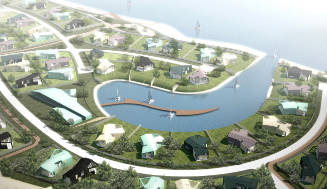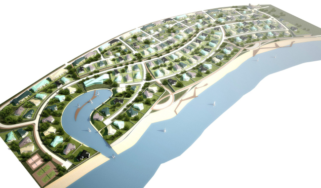 Нужно сказать, что величественная река и для архитекторов Асадовых стала ключевым фактором при разработке генплана будущего поселения. В частности, то обстоятельство, что участок имеет довольно узкую форму и вытянут вдоль Дона, продиктовало создание нескольких «линий» застройки, постепенно удаляющихся от водной глади. Участки на получившейся первой линии застройки непосредственно выходят на благоустроенную набережную реки, а между 2 и 3 линиями архитекторы расположили центральный бульвар поселка. Впрочем, активную пластику генплану придает не только плавно изгибающееся русло реки, но и искусственная марина – далеко вглубь территории архитекторы отводят водный рукав, по своей форме в плане напоминающий петлю или большую перевернутую запятую. Соответственно, и все продольные улицы в поселке, включая уже упомянутый центральный бульвар, оказываются не прямыми, а послушно изгибаются, обходя искусственный водоем. Благодаря этому архитекторам удается избежать монотонности планировки, казалось бы, изначально заданной самой конфигурацией земельного надела.
