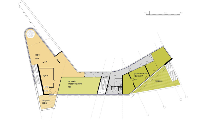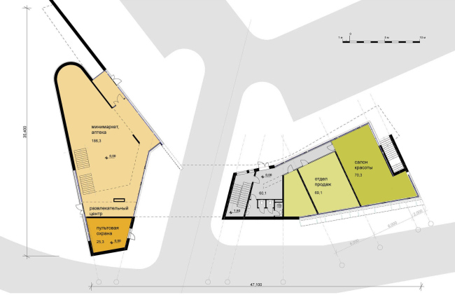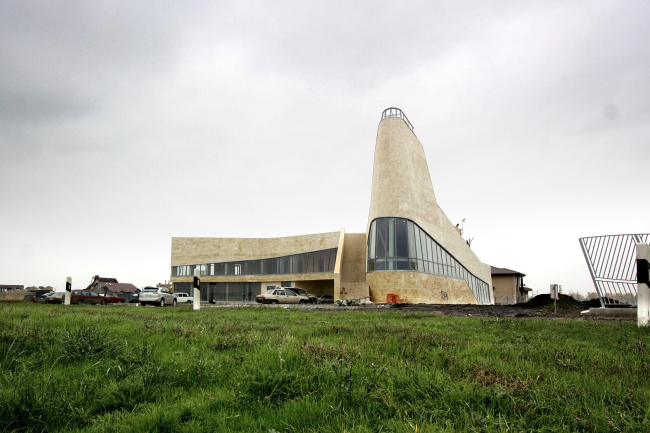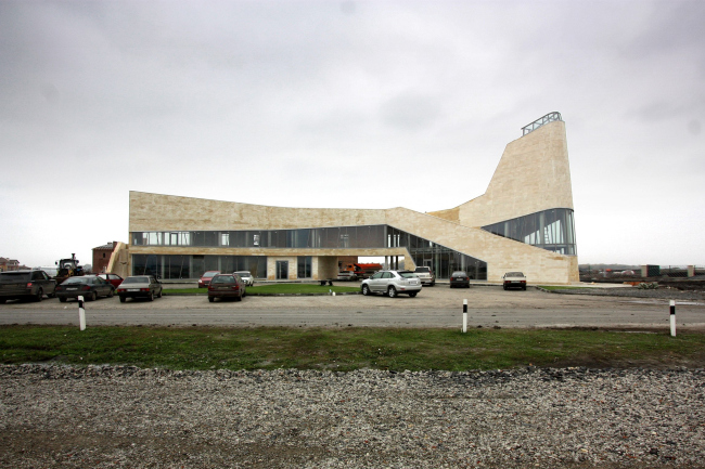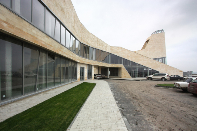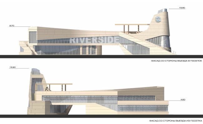 Визитной карточкой всего комплекса служит здание въездной группы. Оно задумано архитекторами одновременно и как своеобразный «маяк» на въезде в поселок, и как смотровая площадка, с которой открывается вид на будущие землевладения и бескрайние просторы казачьих степей. Последняя расположена на верхнем уровне башни, и подняться на нее можно как из самого здания, так и непосредственно с улицы. Соответственно, сам комплекс представляет собой ассиметричную композицию, одно крыло которой вздымается как нос корабля. В этой части комплекса расположены минимаркет, аптека и развлекательный центр, в противоположном же крыле разместились салон красоты и отдел продаж компании-застройщика, а в арке-галерее, соединяющей два объема и превращающей их в полноценные въездные ворота, архитекторы предусмотрели детский центр и кафе. Здание расчерчено динамичными стеклянными горизонталями окон и облицовано бежево-песчаным бакинским камнем, цвет которого идеально рифмуется и с южной архитектурой в целом, и со сдержанным колоритом окружающей поселок степи.