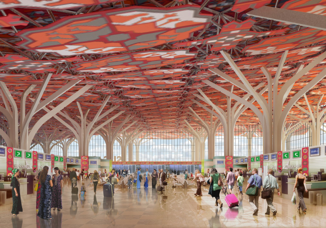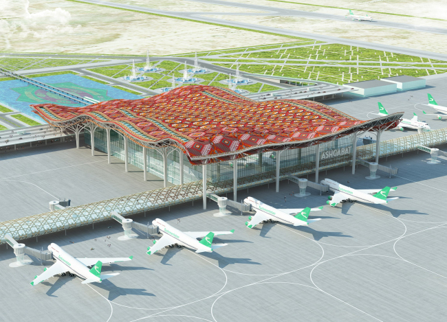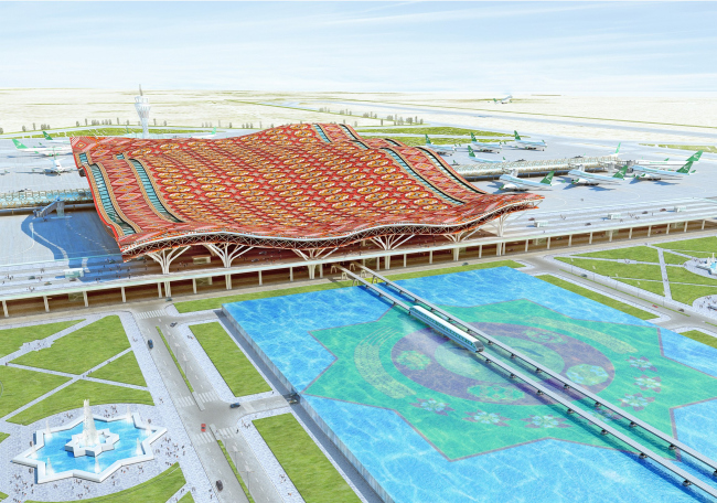 Образ ковра-самолета пришел архитекторам в голову практически сразу, как только они начали работать над проектом аэропорта. Трудно спорить с тем, что этот сказочный вид транспорта как нельзя лучше отражает и функцию объекта, и едва ли не самую известную «валюту» Туркменистана – создаваемые здесь фантастически роскошные и дорогие ковры. В общем, оставалось только придумать, как обыграть его в облике нового аэропорта. Конечно, можно было «бросить» ковер на площадь перед пассажирским терминалом или даже стилистически воссоздать гёли между взлетно-посадочными полосами, но архитекторы выбрали более сложный путь – яркое ковровое полотно было трактовано ими как кровля основного здания аэропорта.