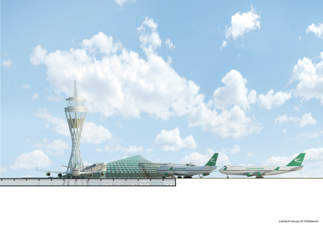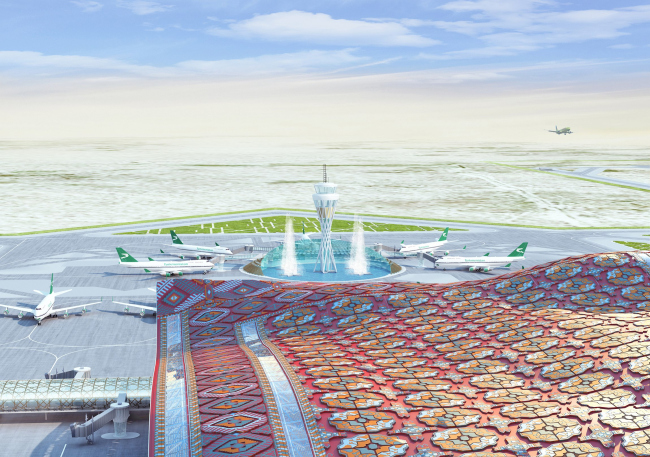 В заключение остается добавить, что оба терминала вписаны в восьмиконечную звезду, которая, в свою очередь, хирургически точно вписана между двумя взлетно-посадочными полосами. Углы этой сложной фигуры украшены орнаментом, который предполагается создать с помощью зеленых насаждений. И даже этот казалось бы сугубо декоративный прием таит в себе важный символический смысл – зеленый цвет для туркмен испокон веков был священным. Воплощая идею благоденствия и единения времен, он в данном случае будет символизировать и способность человека противостоять испепеляющему жару расположенной по соседству пустыни.