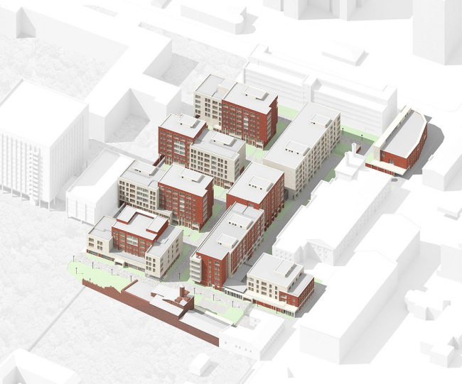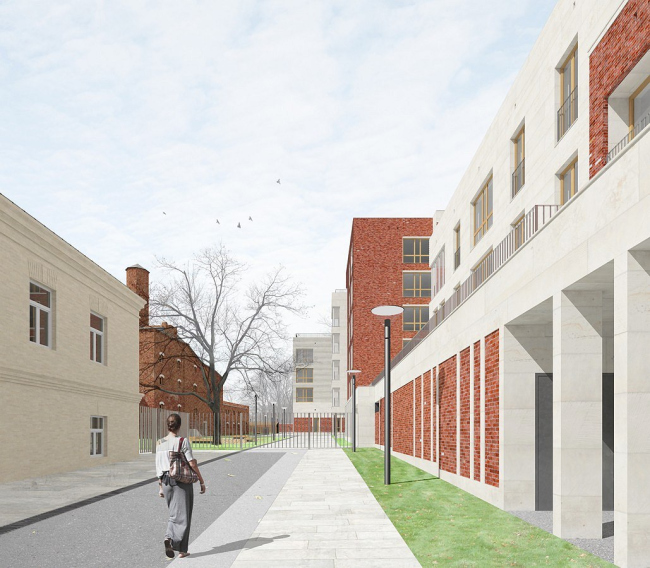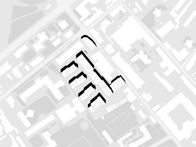 Всего в состав комплекса войдут 7 строений, включая уже упомянутую пивоварню. При этом, поскольку по Россолимо и Льва Толстого сохраняются два протяженных корпуса Экспериментального завода напитков и бывшего заводского здания, присутствие новых объемов на обеих улицах сведено к минимуму. С Россолимо жилой комплекс фактически будет связан лишь трассой заезда, а на Льва Толстого смотрят два малоэтажных здания, как бы фланкирующие сохраняемый корпус. Одно из них – угловое, и именно в силу своего расположения на оживленном перекрестке, утрачивает жилую функцию – здесь авторы проекта предлагают разместить магазины и галерею. Второй объем, «прорывающий» существующую застройку, – это уже часть жилого дома, в плане напоминающего букву «Г», чья длинная сторона спрятана в глубине квартала.
