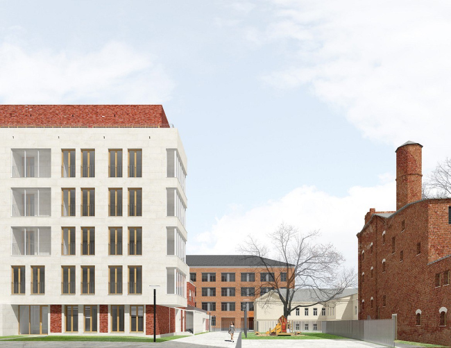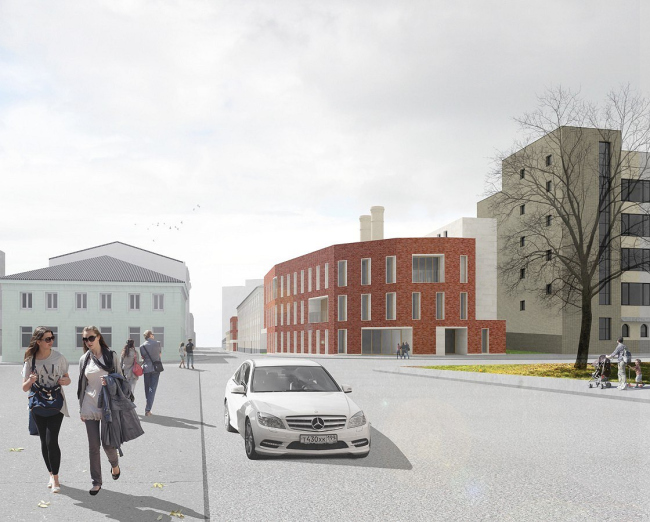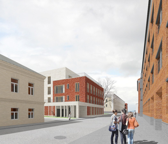 Пятиэтажный корпус, расположенный ближе всего к пивоварне, решен немного иначе: здесь центральный краснокирпичный объем словно обнимают два белокаменных крыла. Подобную аллюзию на классицистическую композицию можно считать данью соседству с усадьбой, а само размещение этого дома практически на углу подтолкнуло архитекторов к созданию в нем детского сада. Очень кстати оказался и отступ от бывшей пивоварни – здесь разместится игровая площадка дошкольного учреждения. Что же касается самого исторического здания, то его функция изменится – здесь будет организован фитнес-клуб. Сначала в бывшей пивоварне собирались создать музей пива или пивной ресторан, но ни детскому саду, ни элитному жилью в целом такое соседство оказалось не нужно.