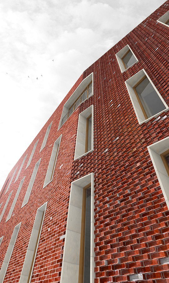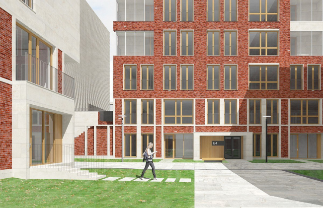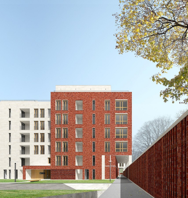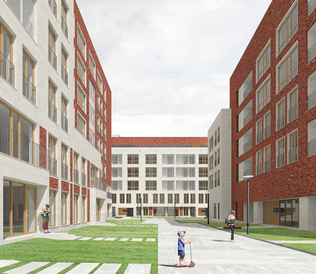 Каждый объем авторы складывают из двух «половинок» – белой и красной, причем от дома к дому их порядок меняется, благодаря чему каждый двор приобретает индивидуальный облик. Если учесть, что ширина дворов составляет всего 20 метров (плотность застройки изначально была задана максимально высокая), становится понятно, насколько это важно для создаваемых пространств. И для того, чтобы еще больше насытить их визуальную среду, архитекторы каждому фасаду придают ярко выраженную текстуру: кладка кирпича и камня постоянно варьируется, а сами эти материалы словно прорастают друг в друга.