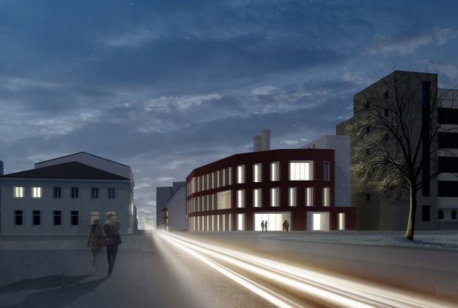 И если со стороны усадьбы великого писателя визитной карточкой проектируемого комплекса станет брутальное кирпичное здание с трубой и наложенные друг на друга красно-белые плоскости фасадов новых корпусов, то его «парламентером» на самой улице Льва Толстого, конечно, будет угловой объем галереи. По сути, архитекторы могли придать ему любую, сколько угодно динамичную форму, но они и здесь остались верны духу места – в плане здание повторяет первоначальные границы территории, а его главный фасад словно перегнут в нескольких местах. Эти ломаные уступы подчеркнуты с помощью «распушенной» кладки кирпича и более масштабных оконных проемов с глубокими откосами. Благодаря столь активной и экспрессивной реакции фасада на свое ближайшее окружение, здание обещает стать неотъемлемой частью существующего перекрестка.Жилой комплекс на улице Льва Толстого © Сергей Киселев и Партнеры