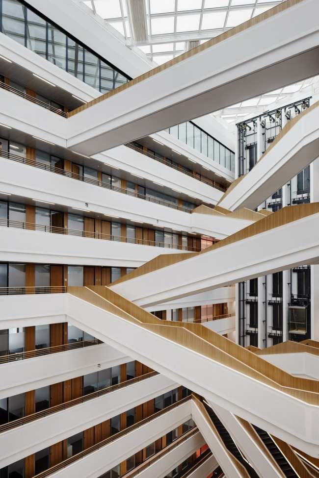 Интерьеры общественных зон штаб-квартиры решены в традиционном для современного скандинавского дизайна ключе – в них преобладают белый цвет и медовый оттенок натурального дерева.