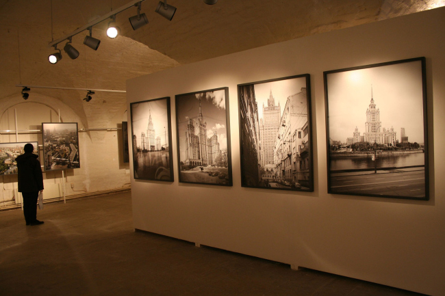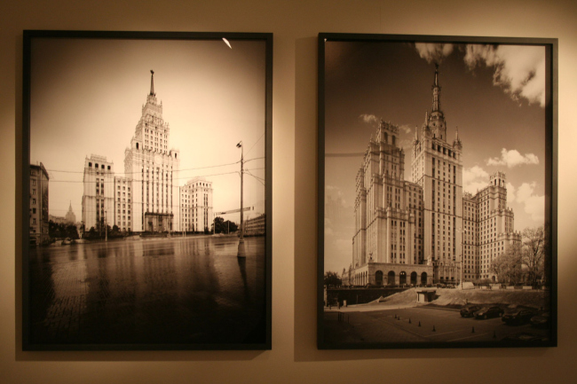 Экспозиция разбита на мини-отделы, каждый из которых посвящен отдельной «высотке» – гостинице «Украина», МГУ, административному зданию на Красных воротах и прочим. Подобный географический принцип, безусловно, здорово облегчает жизнь посетителям, помогая сориентироваться в городских панорамах и, мысленно вознесясь на ту или иную высотку, вдумчиво следовать за взглядом фотографа. Отдельный стенд занимают крупные «персональные портреты» самих высоток. И если современный город с его пробками и стройками Базилико представляет во всей свойственной мегаполису пестроте, то сами «семь сестер» сфотографированы на черно-белую пленку. Величественные кадры как бы отсылают зрителя к прошлому, заставляют вспомнить известные фотографии сталинской архитектуры 50-х и 60-х годов (работы Наума Грановского и прочих). И, пожалуй, сочетание фоторабот, сделанных «под старину», и фотографий современной Москвы нагляднее всего демонстрирует разницу в восприятии города, заставляет задуматься над переменами, произошедшими с мегаполисом за последние пятьдесят лет.