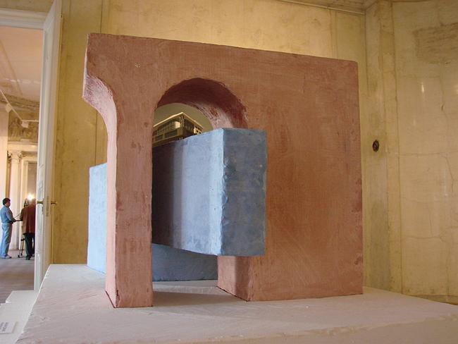 Выставка тонко срежиссирована; она лаконична – при желании в анфиладе музея можно разместить и больше, но насыщена впечатлениями. В каждом зале – большой скульптурный объект, потомок макета, задающийся целью истолковать пластический смысл одного из крупных проектов Бавыкина. Четыре объекта сделаны с соавторстве с художником Александром Джикия, они нарочито рукотворны и покрашены в два цвета, чтобы лучше читалось взаимное проникновение архитектурных объемов, например гигантской канелированной колонны и «схватывающих» ее консолей, или арки руины и продетого в нее авангардного «носа». Таким образом, «архитектурные скульптуры» одновременно «держат» пространство и истолковывают архитектуру, показанную на стендах. Еще два макета-объекта выполнены в соавторстве с Борисом Черствым.