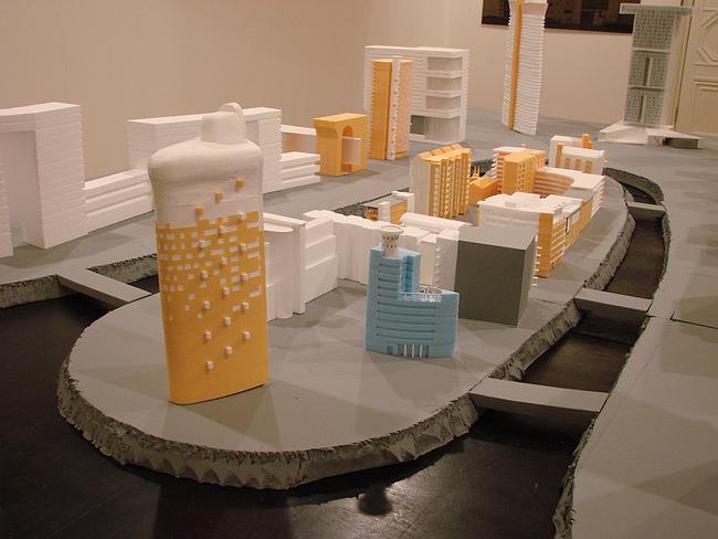 Итоговый акцент выставки – последний зал, в нем из оранжево-белых макетов зданий, спроектированных Алексеем Бавыкиным, устроен небольшой городок, со своей речкой, напоминающей московский Обводной канал, но только сильнее изогнутой. В центре, на полуострове, собраны дома поменьше, снаружи, как полагается – высотки. Называется все с присущим выставке юмором – «согласованный город», намекая, вероятно, на то, что населяющие его проекты уже прошли все инстанции и теперь могут спокойно «жить», собравшись, для ясности, в одном месте, и постепенно дожидаясь того, о чем мечтает любая архитектура – воплощения. Проект для конкурса «Стиль 2001 года». 1984 г.
