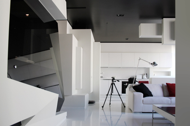 Границы жилого пространства существенно расширяются и за счет выбранной двухцветной палитры – все параллелепипеды, от мала до велика, здесь выкрашены в ослепительно белый цвет, тогда как «пустоты» – потолок и отдельные ниши – оформлены черным цветом. Сами архитекторы получившийся объем сравниваются с белым городом, раскинувшимся под ночным небом. «Белый цвет лучше всего выявляет форму, черный же символизирует дыру, пустоту», – комментируют они.