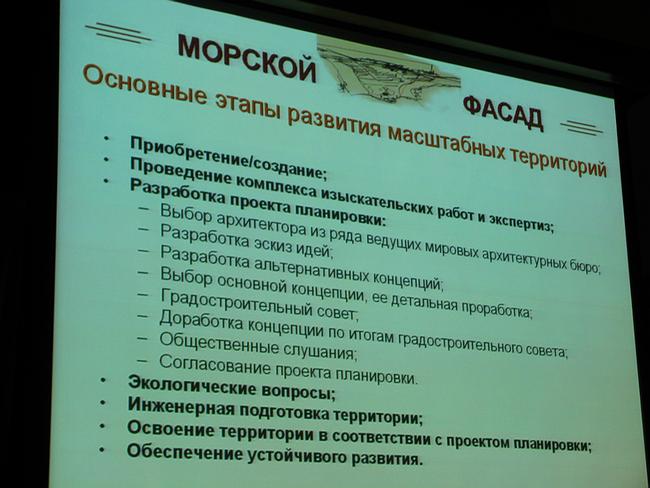 Рассказ Сергея Чобана был посвящен идее полифункциональной среды, где есть все для жизни, работы и отдыха. В этом смысле главной задачей, которую ставит перед собой архитектор – это соединение разных функций и формирование лица здания. Архитектор отстаивал идею многофункциональности в башне «Федерации» и рад, что сейчас рядом с офисами будет более десятка этажей гостиницы, апартаменты и общественные зоны в нижних этажах. Для Санкт-Петербурга в исторической среде, возле строящегося Охта-центра (Газпром-Сити), Сергей Чобан сейчас делает мастер-план бизнес-квартала, где сохраняются даже не охраняемые государством заводские здания, призванные воссоздать дух былого промышленного района. Архитектурное бюро Genslers Masters Planning Group в лице Пола Файнберга и девелопер Лев Пушканский показали проект нового уже строящегося делового, жилого и общественного центра в Санкт-Петербурге «Морской фасад». Этот район будет размещаться на Васильевском острове, на берегу Финского залива, возвращая острову ту градостроительную роль, которую приписывал ему еще автор первого плана Петербурга Жан-Батист Леблон, задумывая сделать на этом месте центр города, с выходом к большой воде. С позиции современности, большой бизнес центр это долгожданный проект для города, охваченного «серым поясом» промышленности и страдающего неразвитостью бизнеса и сосредоточением его в исторической части города. Местоположение «Морского фасада» на карте города, по мнению авторов, достаточно удобное: в 6–7 км от исторического центра, скоро эта часть острова будет оснащена двумя станциями метро и сеткой трамвайных путей, центр напрямую будет соединен с 2 аэропортами радиальными трассами, соединяющими крайние точки проектируемой «кольцевой» дороги, а еще новый район выходит к заливу, где будет построен порт с семью пассажирскими причалами (порт затем собирается выкупить город).