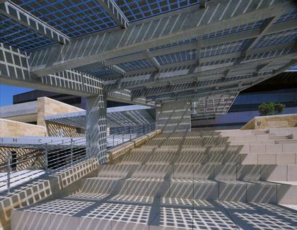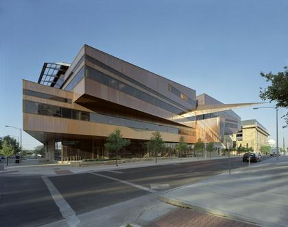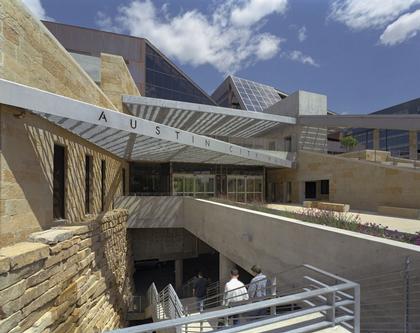 Комплекс мэрии с новой площадью перед ним расположен в «Складском районе» столицы штата Техас. Эта бывшая промзона превращается теперь в территорию клубов, ресторанов, новых офисных зданий и элитного жилья. Поэтому было логичным перенести важное административное здание именно туда, на берег озера Таун Лейк. Постройка из известняка, меди и стекла окружена открытым пространством с новаторским ландшафтным дизайном, куда редкое в этой местности сочетание зелени, воды и тени должно привлекать горожан. Внутри, на площади в 11 000 кв. м находятся администрация мэра Остина, офис управляющего городом, залы заседаний и кабинеты членов муниципального совета, а также кафе и магазин. Мощная стена из известняка начинается на уровне скального основания глубоко под землей. Из нее «вырастают» два нижних этажа здания, также облицованных этим камнем. Верхние яруса здания обшиты листовой медью, из этого же материала сделана крыша. Вестибюль постройки занимает четыре этажа здания, его внешняя стена застеклена, а перекрыт он полированными медными панелями, которые отражают солнечный свет внутрь помещения. Его пересекают мостики, позволяющие быстрее попасть из одной части здания в другую. Рядом с постройкой устроены трибуны, перекрытые тентом из солнечных батарей. Он вырабатывает 10% электроэнергии, потребляемой комплексом мэрии, что должно гарантировать проекту Предока золотой сертификат LEED за рациональное использование ресурсов.Здание городской администрации Остина. Фото: That Other Paper via flickr.com. Лицензия CC BY-SA 2.0