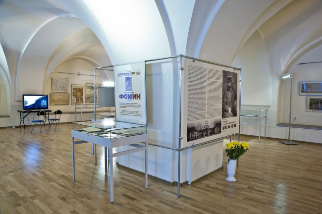 Все главные работы, как реализованные, так и навсегда оставшиеся на бумаге, здесь присутствуют: курзал на минеральных водах, «Новый Петербург», ансамбль зданий Тучкова буяна, Николаевский вокзал. Органично дополняют графику и архивные материалы, в том числе фотографии из семейного архива, каталоги прижизненных выставок, афиши и материалы, связанные с деятельностью Фомина в качестве руководителя Архитектурной мастерской Совкомхоза по урегулированию плана Петрограда. Здесь же установлен монитор для демонстрации ролика, посвященного современному состоянию едва ли не самой известной постройки архитектора – дома Абамелек-Лазарева.