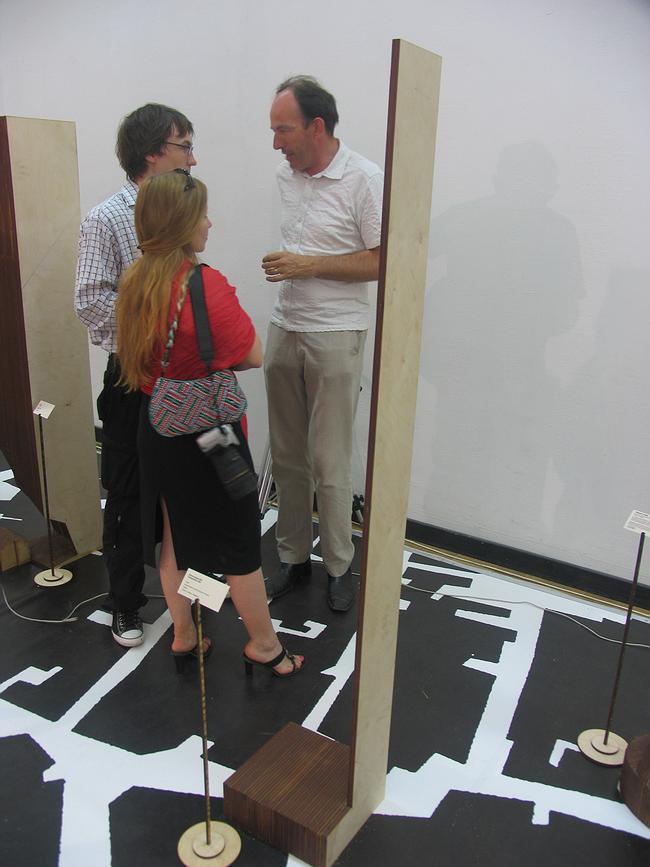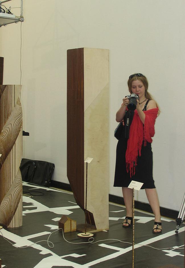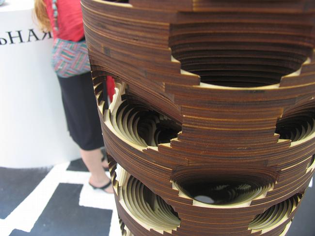 Среди коммерческих экспозиций второго этажа ЦДХ, где проходит Арх Москва, неожиданно встречается городок фанерных небоскребов высотой немного меньше человеческого роста. Они исполнены в одной технике – склеены из слоев фанеры, раскрашенной в коричневый цвет – возможно для того, чтобы было легче оценить разницу концепций. Воспринимается это двояко: с одной стороны, будучи расставлены на схематически нарисованный карте города башни навевают мысли об опасностях точечной застройки, а с другой стороны – демонстрируют размах концептуальной мысли участников конкурса.