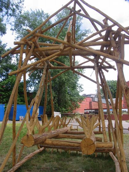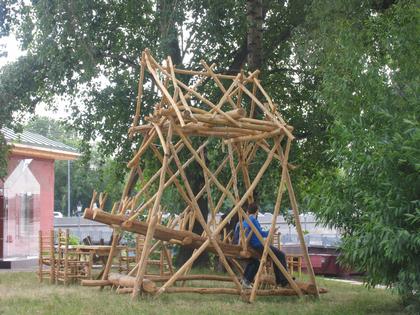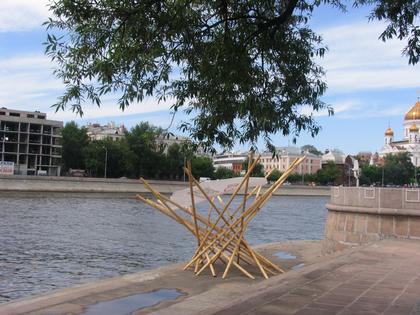 Экспозиция предстоящего фестиваля АрхСтояние в деревне Никола-Ленивец на время «Арх Москвы» расположилась на Стрелке Москва-реки. В этом году фестиваль украшали два веселых проекта, собранных, по преимуществу, из деревянных арт-объектов разных авторов: «Шаман-город» (или фестиваль «Города», который пройдет на Байкале) и «Арх-Стояние» (проводимое в деревне Николо-Ленивец на реке Угре). Между ними много различий, но еще больше сходства, что, в частности, проявилось во взаимном проникновении двух проектов в рамках «Арх-Москвы»: например, «Бубен» Андрея Асадова, предназначенный для Байкала, построили рядом с объектами АрхСтояния на Стрелке Москва-реки, где он отлично смотрелся рядом с ХХС – откровенно говоря, далеко не все поняли, что это два разных проекта. Просто в них сосредоточилось все самое «некоммерческое», столь ущемленное в этом году