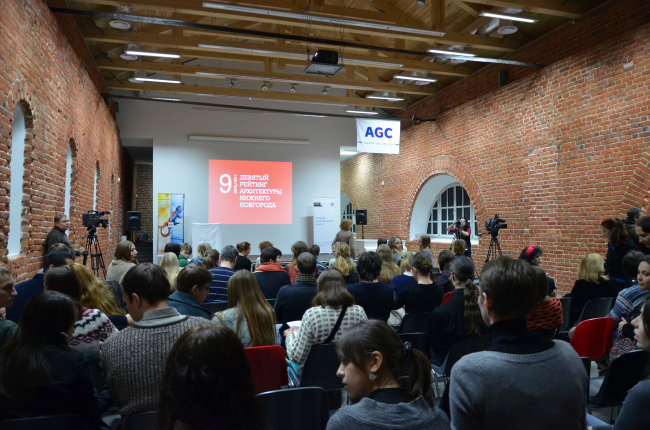 Итоги голосования были оглашены на, хотелось сказать, торжественной церемонии, но на самом деле мероприятие оказалось очень неформальным, дружеским и лишенным всякого официоза. Пятничным вечером, 3 февраля, под сводами Арсенала, где за неделю до этого состоялось открытие приуроченной к Рейтингу выставки «Город есть. Архитектурные вкусы на рубеже веков», собрались нижегородские архитекторы, студенты НГАСУ, журналисты и все те, кто считает современную архитектуру немаловажной частью культурной жизни города, одним из его знаковых брендов. Программа вечера была составлена таким образом, чтобы дать собравшимся представление обо всех объектах, номинированных на Рейтинг, причем о каждом из них рассказывали не авторы, а приглашенные гости – члены жюри, эксперты и представители коммерческих компаний, вот уже несколько лет поддерживающих Рейтинг: Мария Добродеева (компания U-kon), Олег Клочко (компания AGC) и Ольга Миляева (компания Alcotek). Каждый представленный объект награждался специальным дипломом, формулировка которого отражала его наиболее характерную особенность, на которую обратили внимание в своих комментариях члены экспертного жюри. В качестве «звездных» интродукций в программу были включены оригинальные видео-обращения к собравшимся. Их записали Юлия Тарабарина (главный редактор archi.ru), Николай Малинин (архитектурный критик), Макс Малеин (архитектор) и Николай Лызлов (архитектор, руководитель мастерской Николая Лызлова).