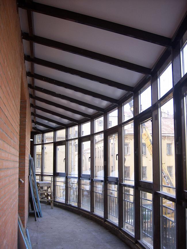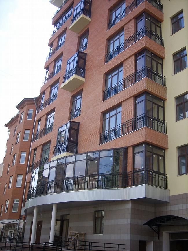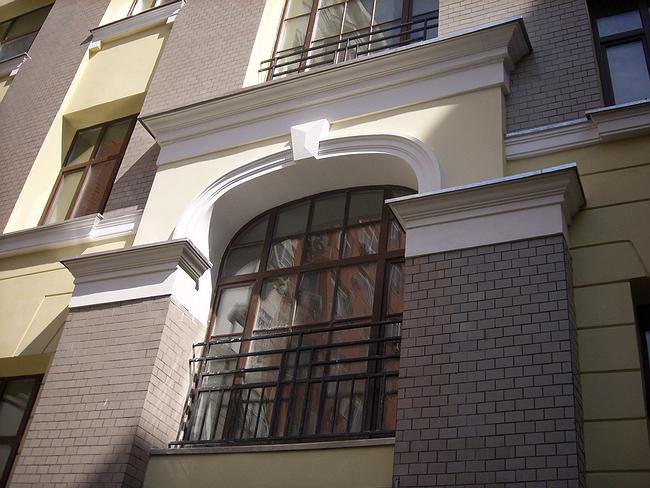 С противоположной стороны дом, напротив, получил основательный новый выступ – кирпичный ризалит, увеличивший внутреннюю площадь квартир. Как и положено новообразованию, он имеет другой цвет и фактуру – старая часть дома желтовато-серая, новая – красно-кирпичная. В ней больше стекол – окна выше и шире и, кроме того, окнами по-конструктвистски заняты углы нового объема – таким образом, здесь квартиры получают максимум дневного света, который можно улучить на северной стороне. На уровне второго этажа устроен целиком остекленный полукруглый выступ – откуда открывается панорамный обзор прилегающего двора. Выдвигаясь во двор, ризалит стремится захватить еще чуточку пространства, выбрасывая, с промежутком с один этаж, закрытые консольные лоджии, оживляющие плоскость и добавляющие еще несколько метров.