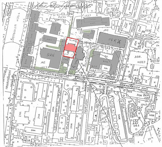 Здание расположено в глубине квартала, недалеко от Якиманки и принадлежащего французскому посольству дома Игумнова. Оно со всех сторон обстроено и застеснено соседними домами, чередующими в своих не слишком изысканных нарядах современный красный кирпич с облицовочной плиткой модерна начала XX века. Однако от Спасоналивковского переулка дом неплохо видно – потому что здесь находится маленький одноэтажный домик, тоже начала XX в., который не может ничего загородить.