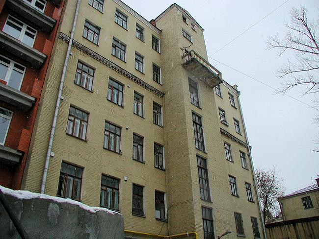 Итак, в 1912 году в глубине одного из дворов недалеко от Якиманки был построен четырехэтажный доходный дом с большими окнами и покрытыми светлой плиткой вертикальными простенками между ними, с большими квартирами по две штуки на этаж и с проездной аркой посередине, ведущей дальше во двор. Затем в 1932 г. его надстроили двумя этажами, протянув вертикали прежнего фасада выше, но уже с помощью одной лишь штукатурки. Арку заложили, а в квартирах сделали коммуналки. В таком виде дом простоял до 2002 года – после чего его реконструировали.