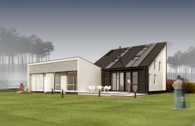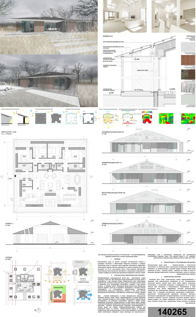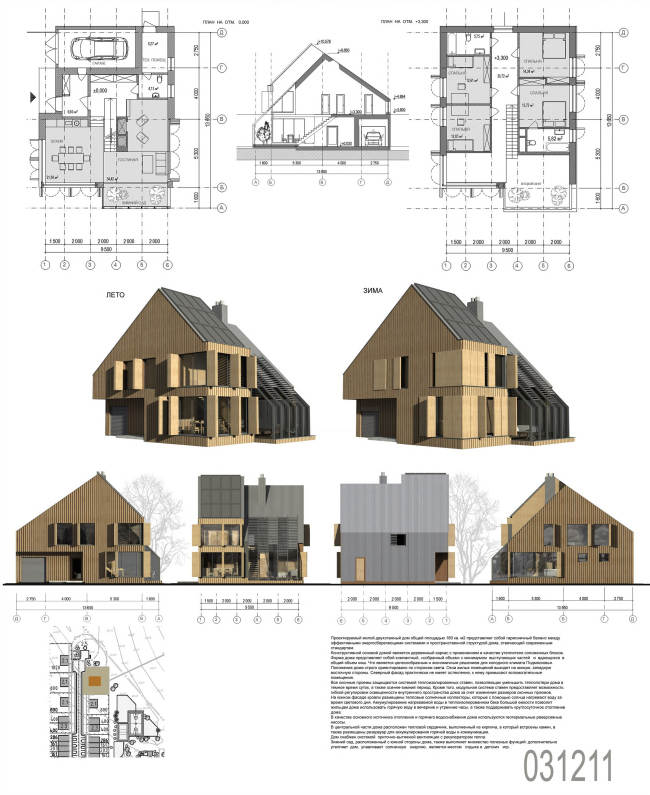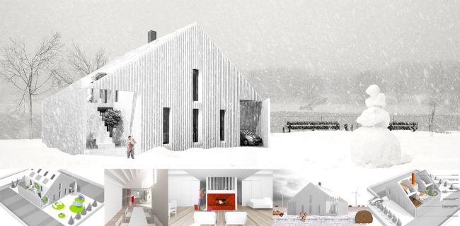 Ринат Гильмутдинов назвал свой проект зима-лето и сделал его «изюминкой» ставни, которые можно закрыть в холодное время и открыть в теплое. Дом строго ориентирован по странам света, а на холодной северной стороне лишен окон. Он также рассчитан на соломенный утеплитель, а внутри расположен «тепловой сердечник» с камином и трубами для горячей воды.