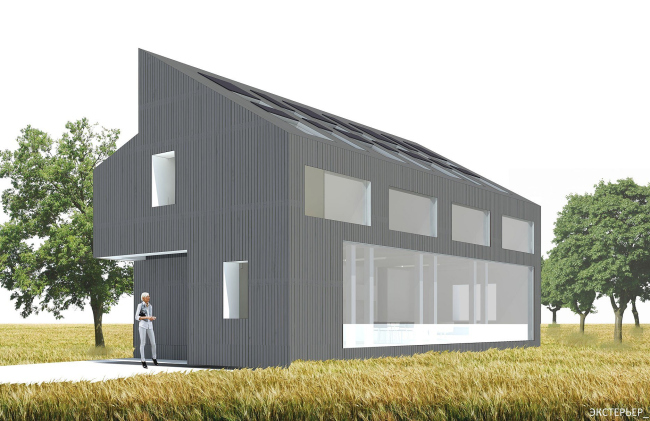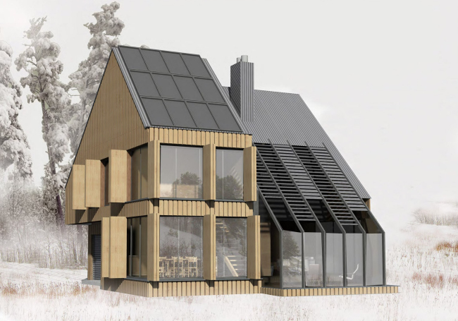 Татьяна Лешихина и Анастасия Грицкова сделали свой дом – для тепла – цельным объемом. Южный скат кровли куба опущен сильно вниз, чтобы улавливать побольше света – а внутри устроено подобие трехуровневого мини-атриума с зимним садом. Авторы позаботилась не только об обогреве дома, но и о его охлаждении летом: для этого на южной стене задуманы парафиновые панели.