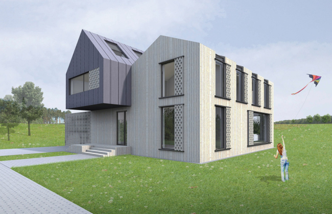 Екатерина Осипова – единственный участник из Петербурга, мысленно разделила свой дом на две части, и только одну из них трактовала как «активный дом». Длинный, уходящий вглубь участка корпус поставлен на высокие «ноги» и снабжен признаками Active house. Другая часть призвана отделить его от дороги; его окна обращены во двор, а на крыше устроена незаметная с улицы терраса. Дом планируется составить из деревянного каркаса с утеплителем из каменной ваты и деревянной обшивкой.