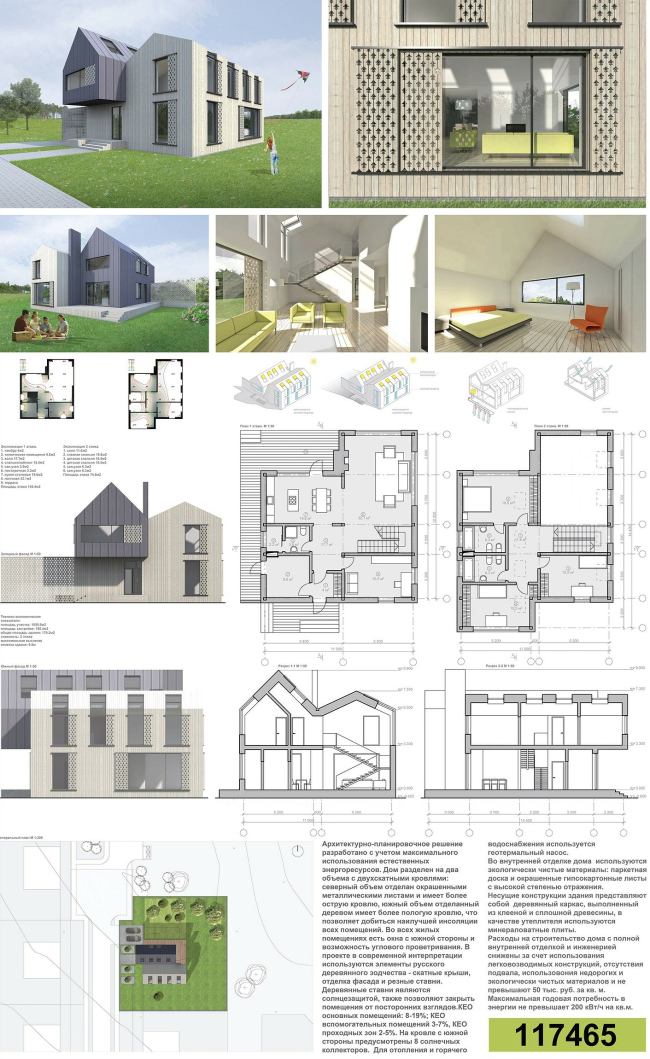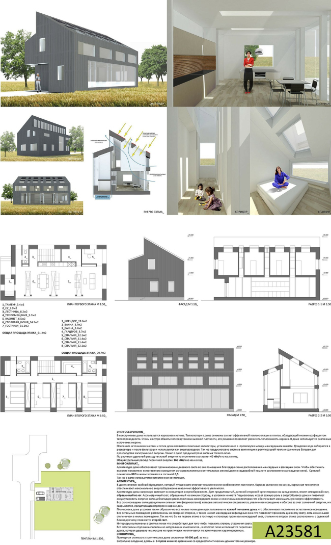 Шамсудин Керимов представил свой активный дом в виде серого объема со срезанным скатом южной кровли, щедро прорезанного окнами, в том числе панорамным – на первом этаже. Экологичность обеспечивает сосновый каркас с утеплителем. Удивительно другое: только этот автор сделал свой проект дешевле заявленного в условиях: 40 вместо требуемых 50 тысяч рублей за метр (общая стоимость дома таким образом уменьшена с исходных 7,5-9 миллионов до шести-семи. Сэкономить миллион, согласитесь, немало, удивляет, что другие участники не задумались об этом). По расчетам автора, его дом будет потреблять в 3-4 раза меньше энергии, чем среднестатистический дом такого размера.