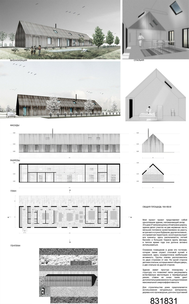 Дом Татьяны Скордули наполнен романтическим переживанием русской избы, и в то же время он – брутально-железобетонный. Бетонная поверхность внешних стен должна, по замыслу автора, нести на себе отпечатки деревянных изб: бревен, досок и даже резных наличников. По смыслу великолепно – тень исчезнувших старых домов на холодной каменной массе похожа на отпечаток окаменелости, когда жизнь ушла, оставив после себя тени формы. Строго говоря, именно это и происходит с нашим частным жильем: «та», старая жизнь, уже практически выветрилась, мы наблюдаем остатки. Возможно, поэтому силуэт дома нарочито груб и напоминает колхозное строение. Гигантская труба на поверку оказывается столь же ненастоящей: дымоход устроен с краю, внутри хозпомещения. Задний (южный) фасад состоит из автоматических стеклянных створок и плотных сэндвич-панелей; летом его можно отрыть целиком, превратив гостиную в открытую веранду, зимой, закрыв, утеплить дом. Стены по идее автора состоят из типовых слоеных панелей: бетон – утеплитель – бетон. Лиричный, эффектный и вдумчивый проект, возможно, один из самых сильных. Хотя неясно, сможет ли пассеизм стать пропуском в будущее. И еще одна деталь – кажется, этот проект – единственный, где в интерьерах нарисована библиотека.