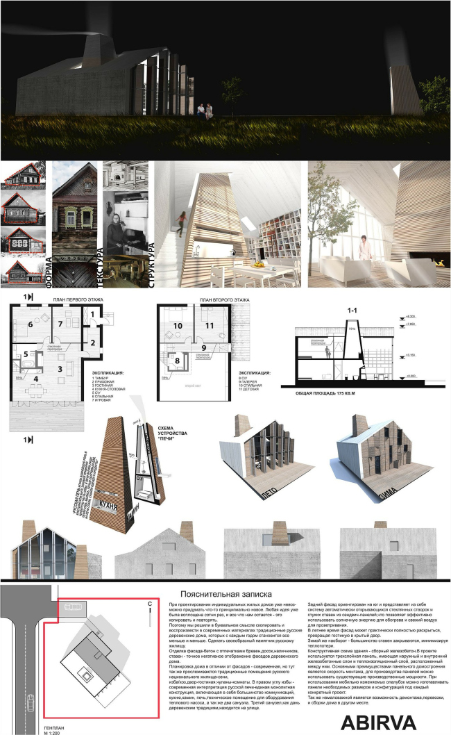 Второй причиной сходства между проектами стало требование учёта традиций и климатических условий. Оно сделало почти неизбежными скатные кровли (впрочем, архитекторы, проектирующие частные дома, уже давно называют плоские крыши в нашем климате не иначе как бредом). Далее, как только участник конкурса углубляется в контекст чуть дальше, возникает печка с трубой и три деревенских окошка. Но очевидно, что не всем традиции по вкусу – несложно почувствовать, как часть авторов тяготится скатными кровлями и они стремятся малость соригинальничать.