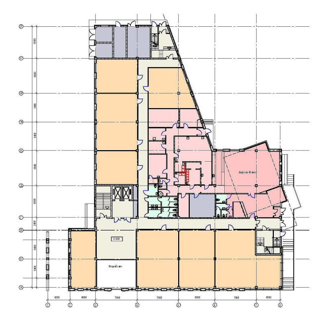 Проектируемое здание позиционируется как офис класса «В», соответствующим образом решена и его внутренняя планировка: с 1-го по 5-ый этажи комплекса заняты офисами, цокольный этаж отведен под парковку. Главный вход в связи со значительным перепадом рельефа также организован в уровне цокольного этажа, а уровнем выше архитекторы предусмотрели небольшое кафе – днем оно будет открыто для работников офисов, а вечером для всех желающих. Для того, чтобы ориентировать кафе на город и визуально подчеркнуть его связь с общественной жизнью, авторы слегка развернули его стены и крыльцо по отношению к основным осям здания.