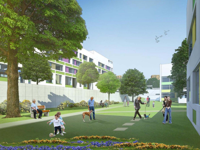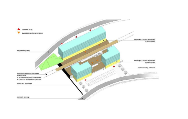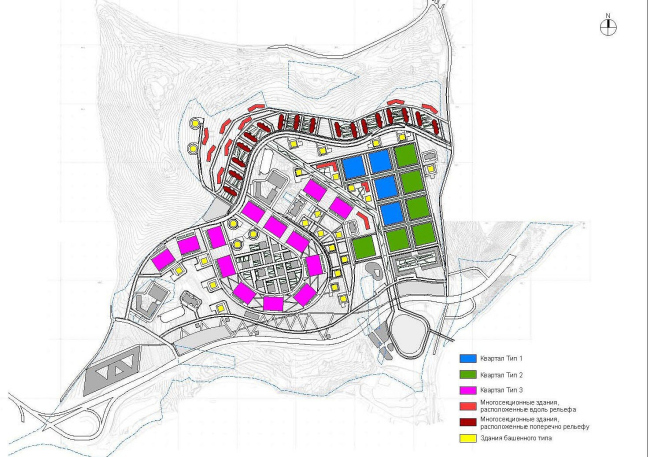 Для относительно спокойного рельефа были спроектированы традиционные квадратные кварталы, по периметру застроенные многосекционными домами. Правда, сам периметр архитекторы при этом не замыкают: в плане дома напоминают буквы Г и L, между которыми оставлены широкие разрывы. Участки, перепад рельефа на которых не превышает 9 метров, застроены похожим образом, только дома здесь решены уже не в виде параллелепипедов, а как каскады, следующие логике склона. Там же, где перепад преодолевает заветную отметку в 9 метров, архитекторы из четырех сторон условного квадрата застраивают лишь две – верхнюю и нижнюю, решая пространство между ними как серию благоустроенных озелененных террас. А в случае, когда уклон не позволяет сделать даже этого, квартал становится треугольным и застраивается домами башенного типа, между которыми организуется полузакрытый двор. Есть в проекте и объемы сложной многоугольной формы, развернутые поперек склонов, – они были разработаны предшественниками ТПО «Резерв», и бюро включило их в состав застройки ради большего разнообразия последней.