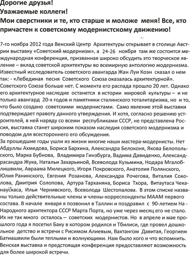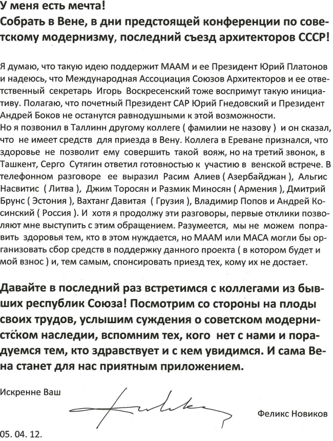Архитектор, теоретик и историк архитектуры Феликс Новиков предлагает друзьям и коллегам встретиться в Вене в ноябре на выставке, посвященной архитектуре модернизма республик бывшего СССР.