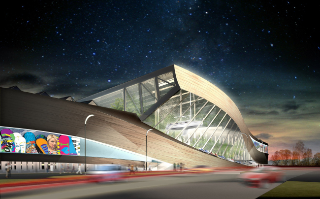 Наружную облицовку планируется выполнить из сандвич-панелей с отделкой, имитирующей текстуру дерева или фанеры, для того чтобы здание выглядело как гнутый деревянный брусок. Атриум, независимо от того, будет на крыше разбит сад или нет, предлагается превратить в зеленый оазис – спустить сверху лианы и ампельные растения. Подобная «фитотерапия» призвана не только напоминать о далеких тропиках, которые можно покорить с помощью продаваемого в ТЦ оборудования, но и поддерживать в покупателях заряд бодрости в любое время года.