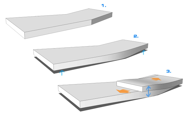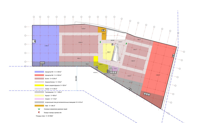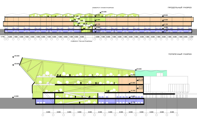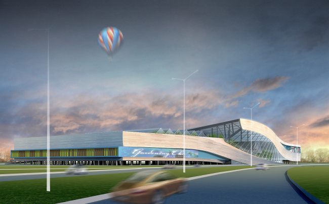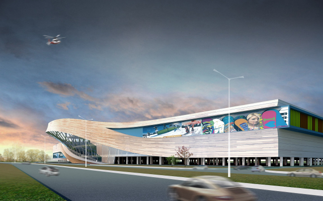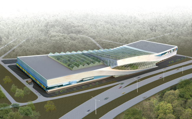 Работа над комплексом в Грибках началась с того, что заказчик показал архитекторам готовую технологическую схему, уложенную в заурядную «коробку», которой как раз и следовало придать яркость. Благо, сама специфика ТЦ к этому всячески располагала. Поскольку в одной половине здания предполагается сосредоточить товары для зимних видов спорта, а в другой – для водных, фабула пространственного развития объема наметилась сама собой. Драматизм сюжету придала форма участка, имеющего небольшой изгиб: на этом переломе здание как бы распадается на две половинки здания. Одна пластина оторвалась от земли и взлетела вверх, другая нырнула под нее. Их боковые грани упруго изогнулись. В «разорванной» ткани фасада засквозило стекло, а на изгибе «прокатилась» высокая «волна» атриума.