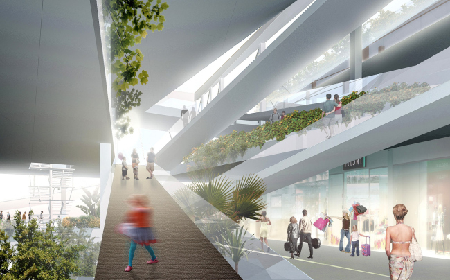 Несмотря на то, что архитектура получилась такой «литературной», ее внешний вид полностью соответствует содержанию. Выразительная скульптурная форма функциональна и рациональна. Под приподнятыми на 5,1 метра над землей торговыми залами разместилась открытая парковка. Помимо нее есть еще подземный паркинг. Попасть из них в двухуровневый торговый центр можно на лифтах из «заземленной» центральной части комплекса. Торговые этажи «прошнурованы» лентами травалаторов, установленных в атриуме. По краям торговой зоны поместились два якорных арендатора – магазины водных и зимних видов спорта. А посередине, вокруг атриума – россыпь бутиков, магазинчиков сопутствующих товаров и кафе. Атриум расширяется кверху как перевернутая пирамида, что визуально создает ощущение еще большего открытого пространства.
