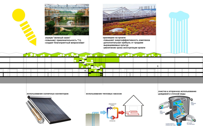 Помимо желания получить яркий архитектурный объект, заказчик также сформулировал требование активно использовать в проекте альтернативные виды энергии, что связано, в первую очередь, с недостатком выделенных на объект энергомощностей. Авторы с энтузиазмом восприняли эту идею и предложили сразу несколько видов прогрессивных энергоэффективных решений: тепловые насосы, солнечные коллекторы, вторичное использование дождевой и сточной воды. Кроме того, архитекторы предусмотрели в проекте возможность создания на кровле комплекса полноценного огорода с теплицами – в них можно было бы выращивать органические овощи для местного фито-ресторана.