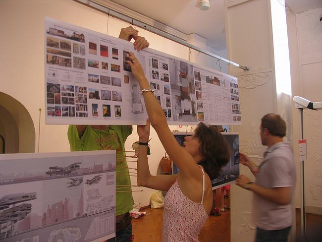 Посвящение выпускников главной и почти единственной "кузницы российских архитекторов" в ряды профессионалов проходило в этом году во второй раз и вероятно оно станет традицией. В интерколумниях Белого зала Центрального дома архитекторов были развешены планшеты с проектами – самыми достойными по мнению каждой из кафедр – и каждому гостю предлагалось проголосовать, прикрепив к понравившемуся планшету палочку с красным, синим или желтым наконечником – соответственно за стиль, идею и индивидуальность. Уже через полчаса многие работы были окружены разноцветными гирляндами, создававшими подобие рамки – чем лучше работа, тем толще рама. В целом проекты, несмотря на юный возраст авторов, не были совсем уж «зелеными» и утопическими, а наоборот – достаточно актуальными, строй хоть сейчас.