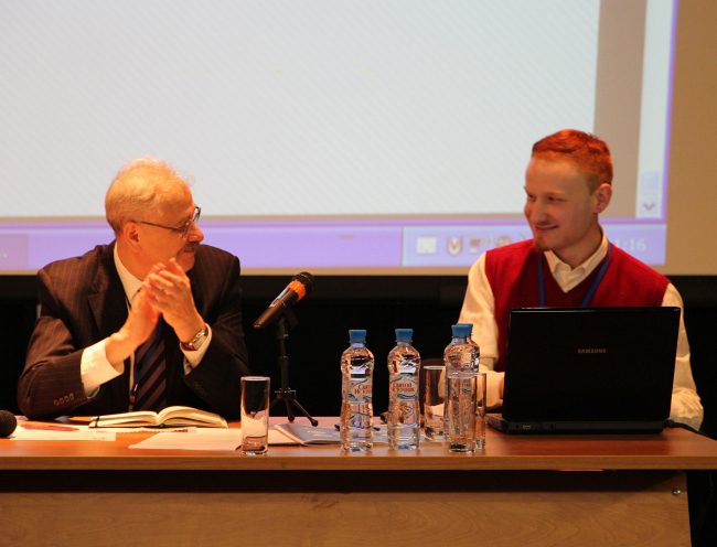 Доклад проф. Юрия Корякина (слева ведущий конференцию Александр Высоковский). Фотографии Натальи Чамаевой