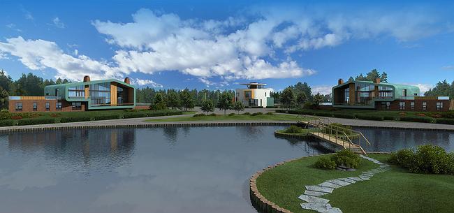 История такова: в поселке был задуман рекреационный центр, а именно декоративный пруд с островками и прогулочной зоной вокруг. Однако через некоторое время было решено выделить почти на самом берегу еще три участка на продажу. А дабы не испортить дорогостоящий образ центральной части поселка непредсказуемыми идеями покупателей по поводу того, как должно выглядеть их жилище, проекты трех окружающих общий пруд домов устроители поселка заказали архитекторам бюро «ПАНАКОМ». Их ансамбль должен образовать центр поселения, окружение его «парадной площади», место которой в данном случае занимает вода.
